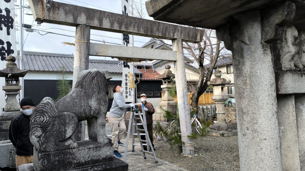 1月4日9時より正月飾りの片付けを行います。担当は南町および町内会長会メンバー。しめ縄、 門松、 幟、 拝殿幕等を撤収、片づけます。